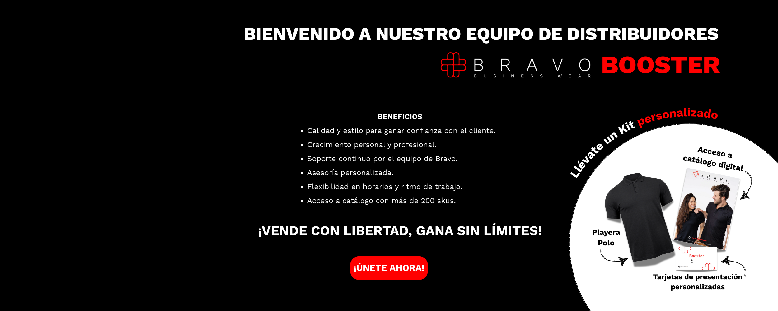 Debes formar parte de Bravo Booster porque aumentarás tus ingresos y llevarás a tu negocio al siguiente nivel. Además, estamos posicionados en el mercado y formamos parte del grupo líder en venta de uniformes y ropa de trabajo.